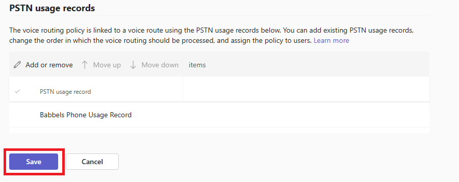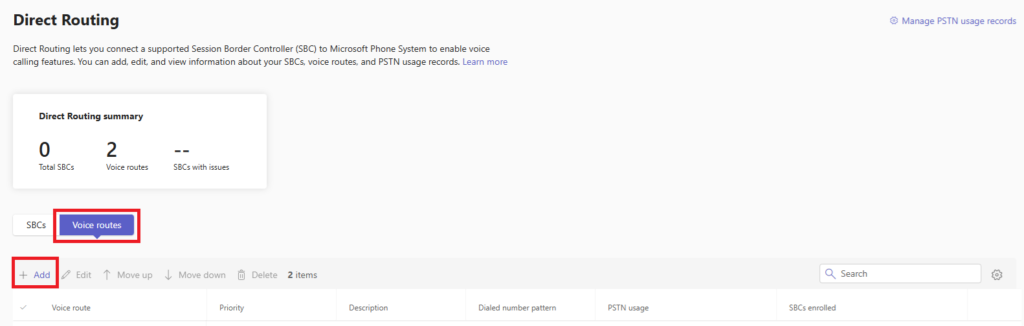 In the Teams Admin portal, under Voice -> Direct Routing, go to the “Voice Routes” tab