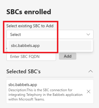 Enter in the description: This is the SBC connection for integrating Telephony in the Babbels application within Microsoft Teams.
